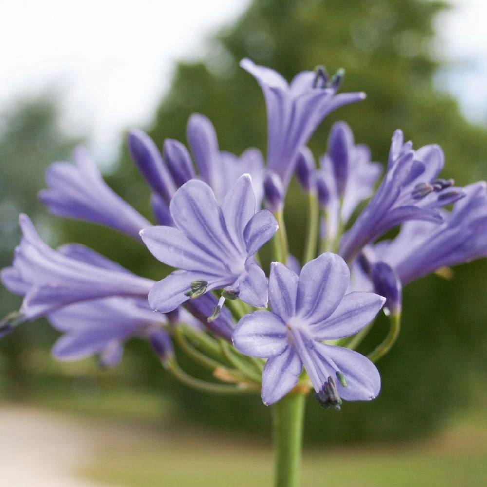 Très florifère entre juin et septembre, l’agapanthe Sophie prodigue ses nombreuses ombelles globuleuses d’environ 10-15 cm de diamètre, portées par des tiges nues d’environ 30/40 cm de haut et bien dégagées du feuillage. Ses fleurs en trompette évasée bleu clair nuancé de lavande sont particulièrement lumineuses.