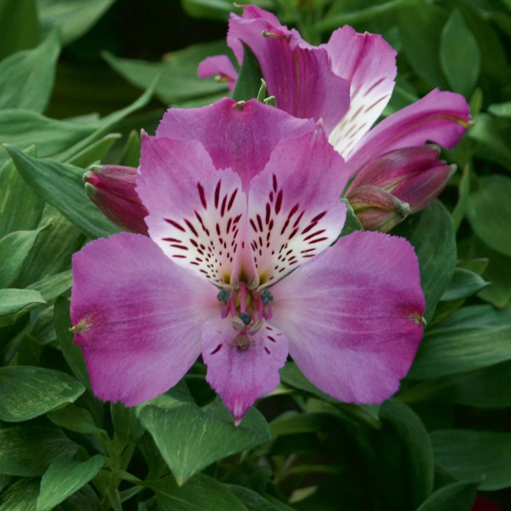 Très florifère de juin jusqu’aux gelées, l’alstroemère Lucas offre ses jolies fleurs d’allure exotique groupées en bouquets sur des tiges courtes et robustes. Ses corolles s’habillent d’un splendide coloris mauve rosé nuancé, teinté de blanc dans le cœur et finement striées de brun.