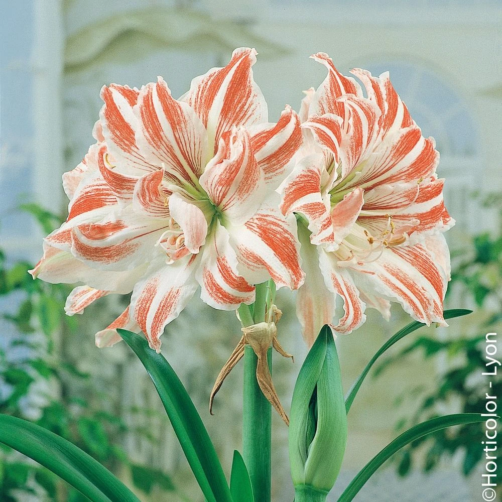 La floraison de l’amaryllis Dancing Queen est vraiment spectaculaire : en fonction de la date de plantation de son bulbe, elle intervient entre novembre et février et dure environ 3 semaines. Le bulbe émet 2 à 3 fortes tiges florales qui atteignent environ 50 cm de hauteur, parfois plus. Chaque tige est couronnée de 2 à 5 boutons qui s’ouvriront progressivement les uns après les autres. Ses fleurs très doubles comptent de nombreux pétales blancs largement veinés de rouge clair, rendant chaque fleur unique !