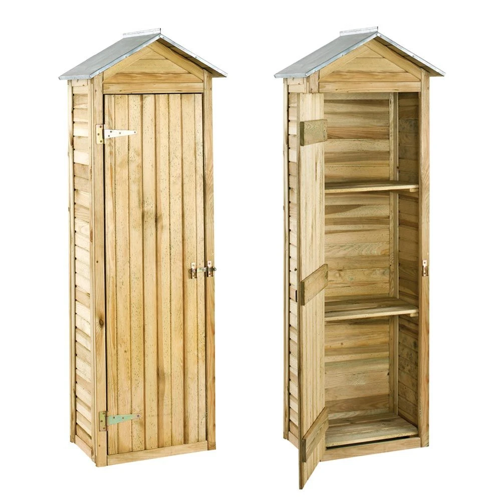 Pour ranger tout le matériel de jardinage. Fermeture en deux temps pour une plus grande sécurité. Armoire de rangement livrée avec quincaillerie pour la fixation de la porte, avec 2 étagères (lg 49 cm environ) + plancher, et plaque en zinc pour couverture.