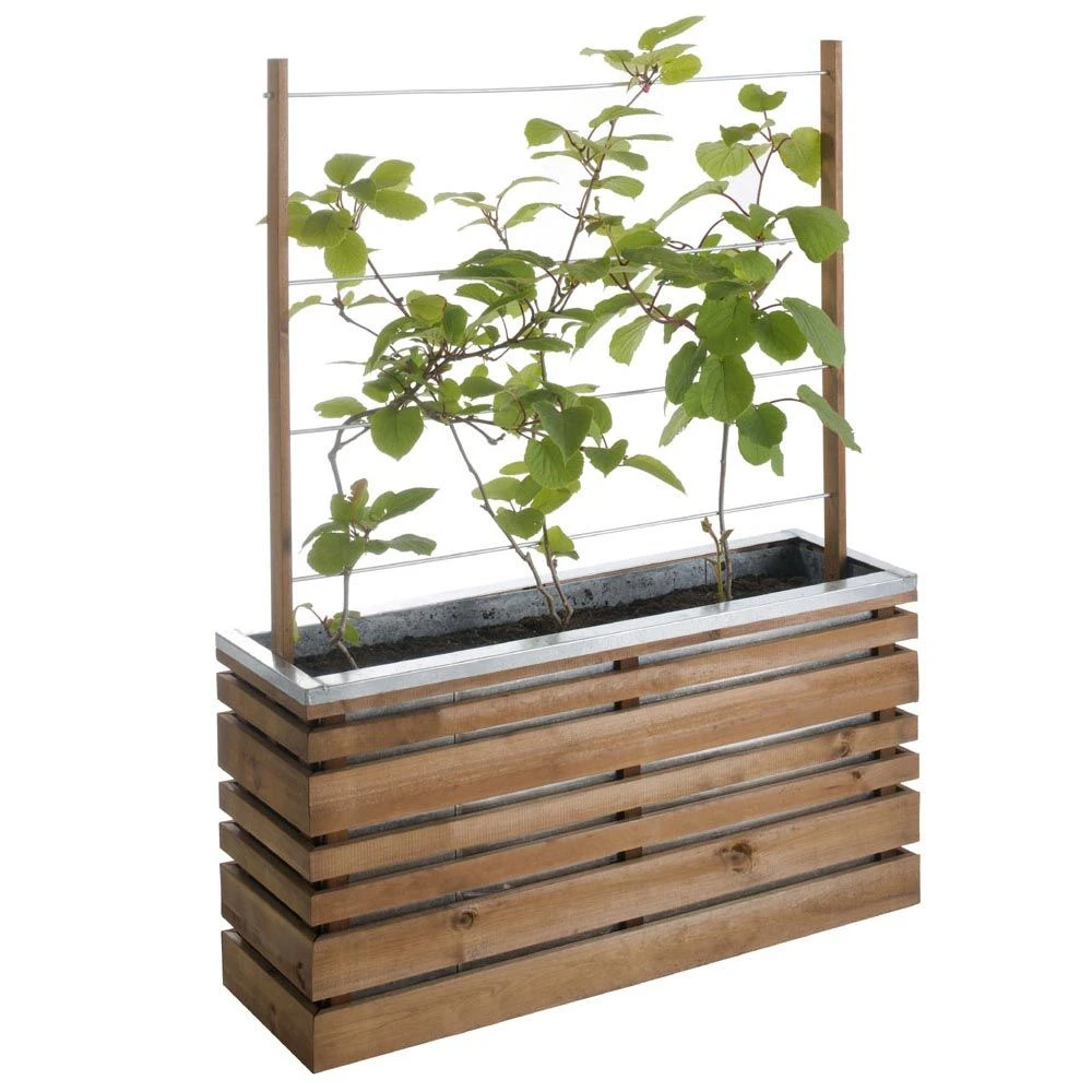 Bac de jardin fabriqué en pin et acier. Le treillis adossé convient particulièrement aux plantes grimpantes (chèvrefeuille, clématite, jasmin d’hiver) et aux plantes volubiles (dipladenia, capucine…). Le traitement par autoclave de classe 3 lui garantit robustesse et stabilité.