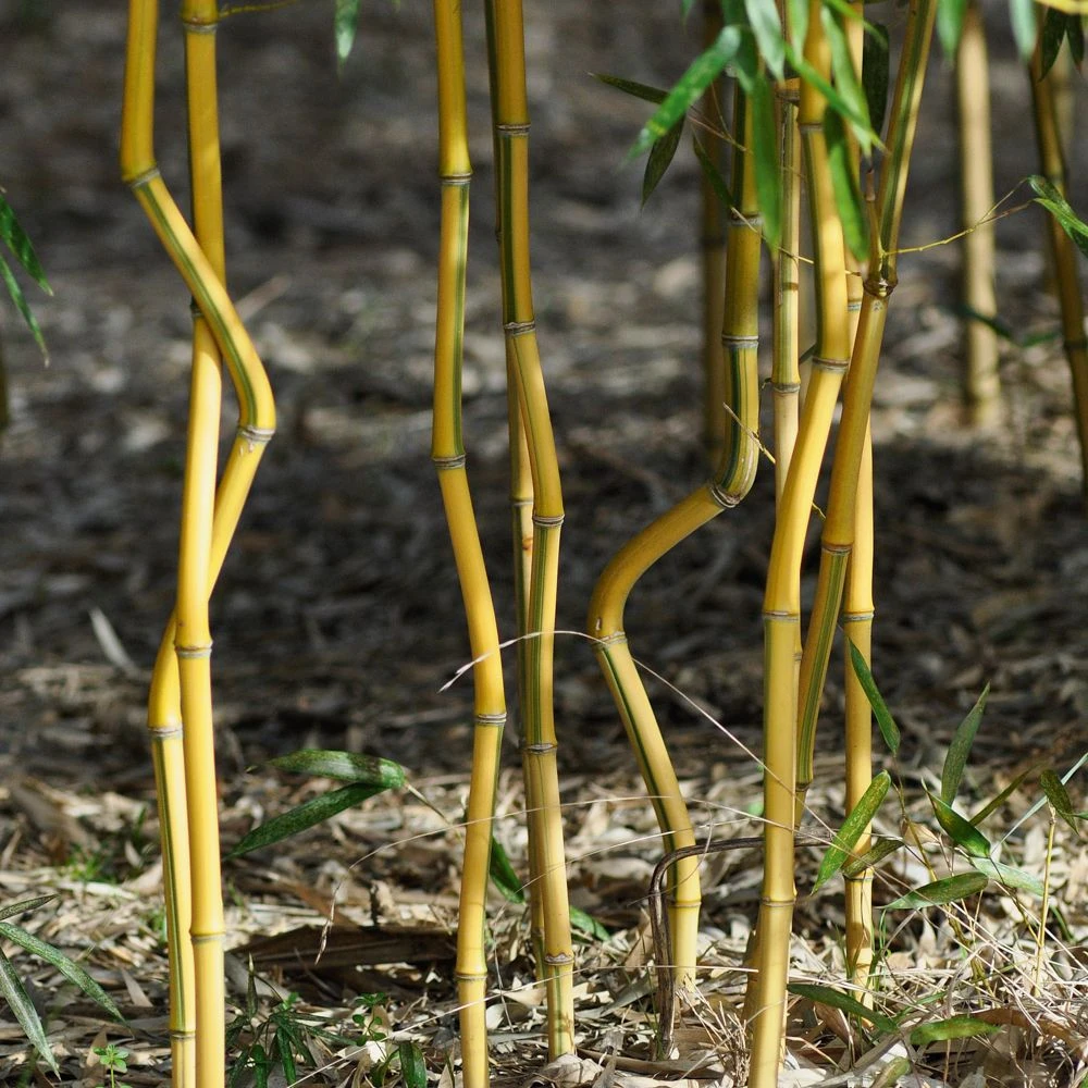 Un bambou de taille moyenne qui produit à sa base de nombreux chaumes en forme de zigzag. Le feuillage est vert foncé et lustré. Un arbuste aux chaumes jaunes, avec des entre-nœuds alternativement striés de vert. Au printemps, les jeunes chaumes situés au soleil prennent une superbe teinte pourpre.