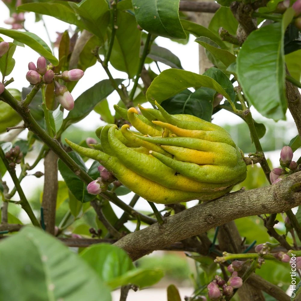 Vénéré en Extrême-Orient, la Main de Bouddha est un fruit très original à l’écorce très parfumée souvent utilisée en pâtisserie. Proche du cédrat, le citrus medica ‘Digitata’ de son nom latin, s’adapte très facilement en pot grâce à son port buissonnant et sa végétation mesurée. Peu rustique, il décore et parfume avec originalité balcons et terrasses à la belle saison.