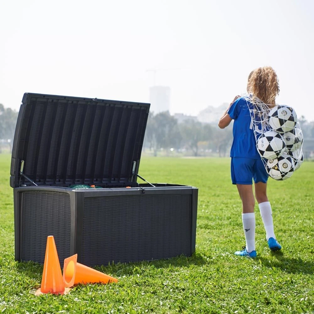 Le coffre de jardin résine Rio gris anthracite de 416 Litre est la solution parfaite pour stocker son matériel de plein air : les jouets des enfants, les outils de jardinage, les coussins d’extérieur, etc. cet espace de rangement conservera son contenu au sec. Aéré, le coffre de rangement extérieur Rio résiste aux intempéries.