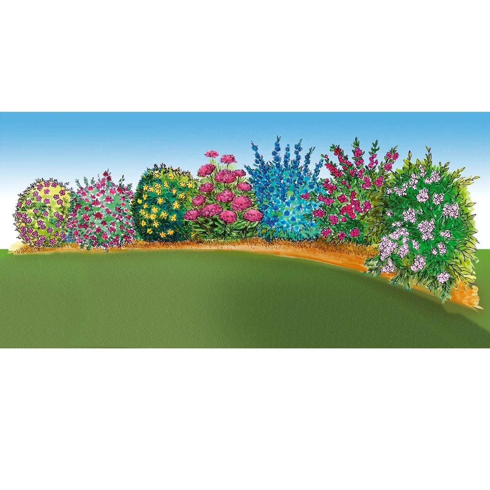 Composition d’arbustes nains pour des bordures multicolores ! Floraison Ă©chelonnĂ©e de mai Ă octobre (distance de plantation 80 cm). Dimension haie adulte : Longueur 6 m, Largeur 60/80 cm, Hauteur environ 80 cm.