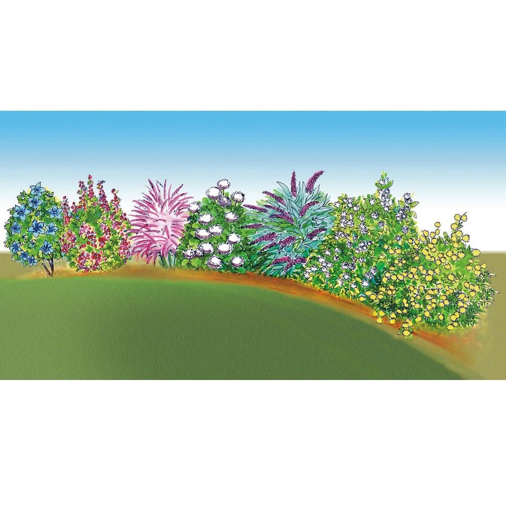 Compositions d’arbustes hauts pour une haie multicolore ! Floraison échelonnée d’avril à septembre (distance de plantation 1m/1,20 m.). Dimension adulte de la haie : longueur 9 m, largeur 1,25 m, hauteur environ 2 m.