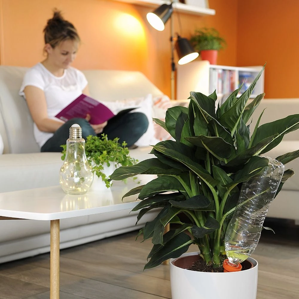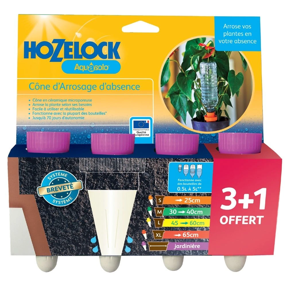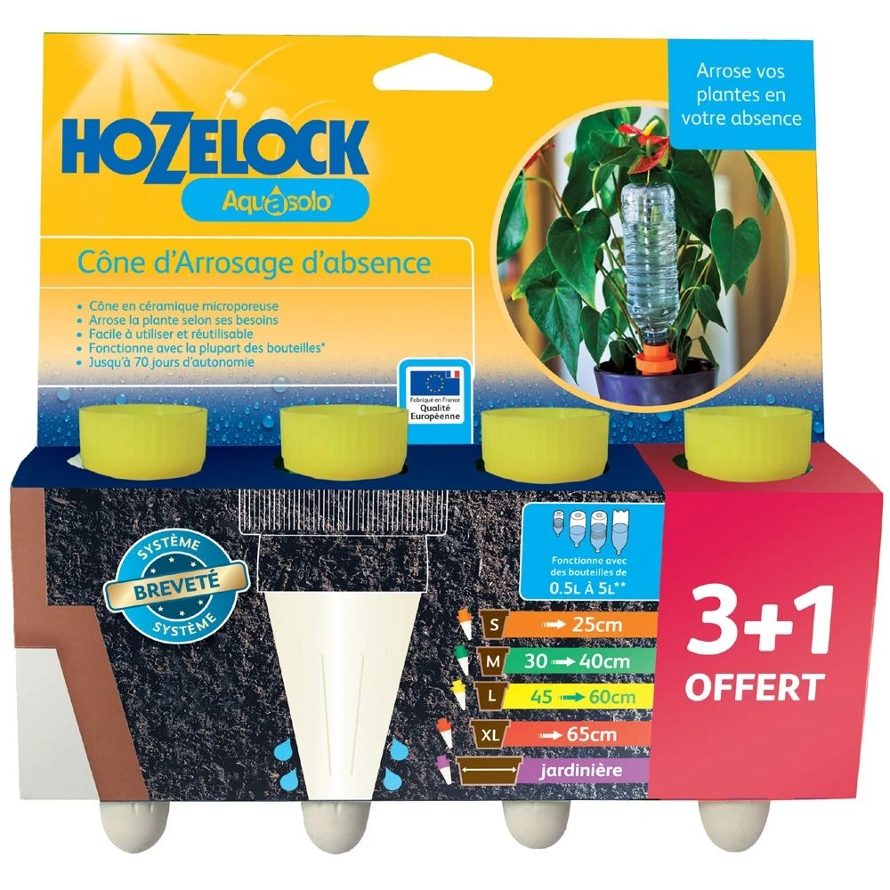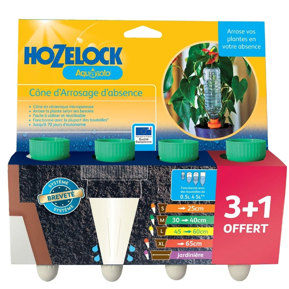 Les cônes d’arrosage AQUASOLO ® conviennent aussi bien à l’humidification des plantes en pot à l’intérieur ou à l’extérieur de la maison. Ils sont parfaits pour garantir l’arrosage pendant vos vacances. L’irrigation de vos plantes est assurée jusqu’à 28 jours d’affilée, selon la taille du pot et du cône.