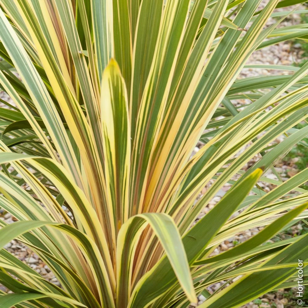 La cordyline ‘Torbay Dazzler’ est lumineuse et décorative toute l’année. D’allure très exotique, elle produit un bouquet de longues feuilles persistantes rubanées de 50 à 80 cm de long, habillées d’un élégant vert olive et largement marginées de jaune clair à crème. Cette panachure lumineuse accentue encore son aspect graphique. D’abord en touffe, elle s’élève progressivement et forme une sorte de tronc qui porte le bouquet de feuillage.