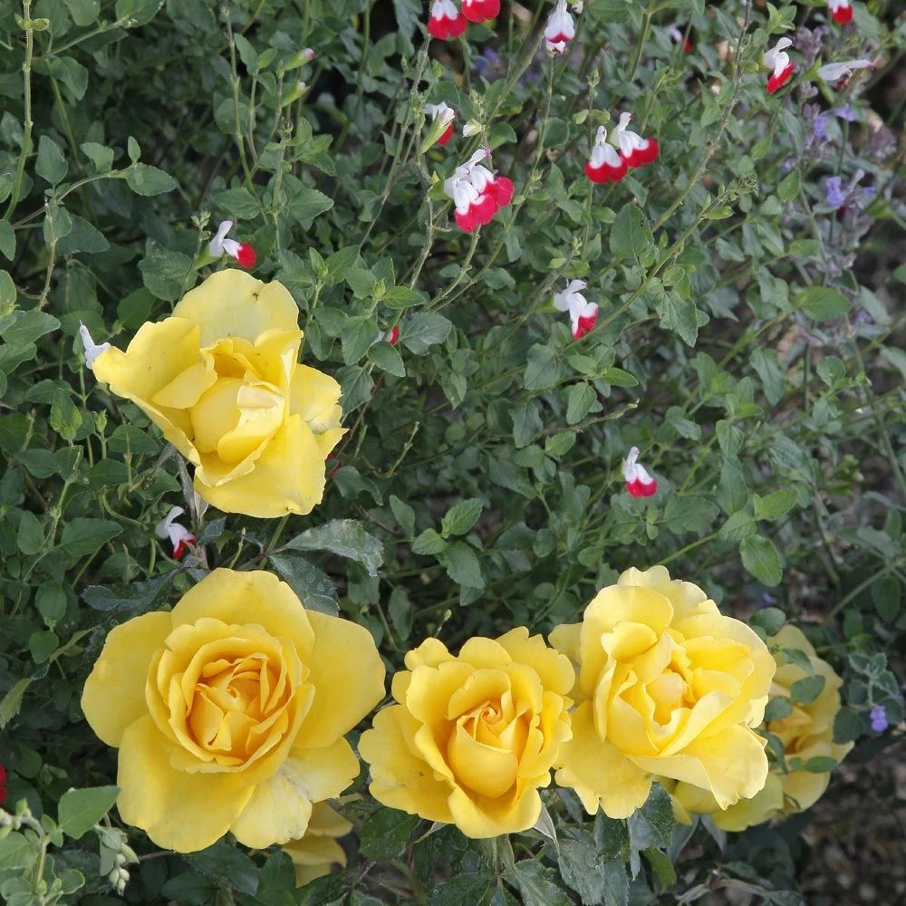 J’ai créé cette belle association lumineuse et facile à réussir pour réaliser 1 m² de massif. Vous profiterez ainsi du printemps aux gelées des floraisons abondantes du rosier RAYON DE SOLEIL ® Meianycid et de la Sauge Hot Lips. Ces 2 belles plantes sont résistantes, RAYON DE SOLEIL ® Meianycid est un rosier ADR, et demandent peu d’entretien.