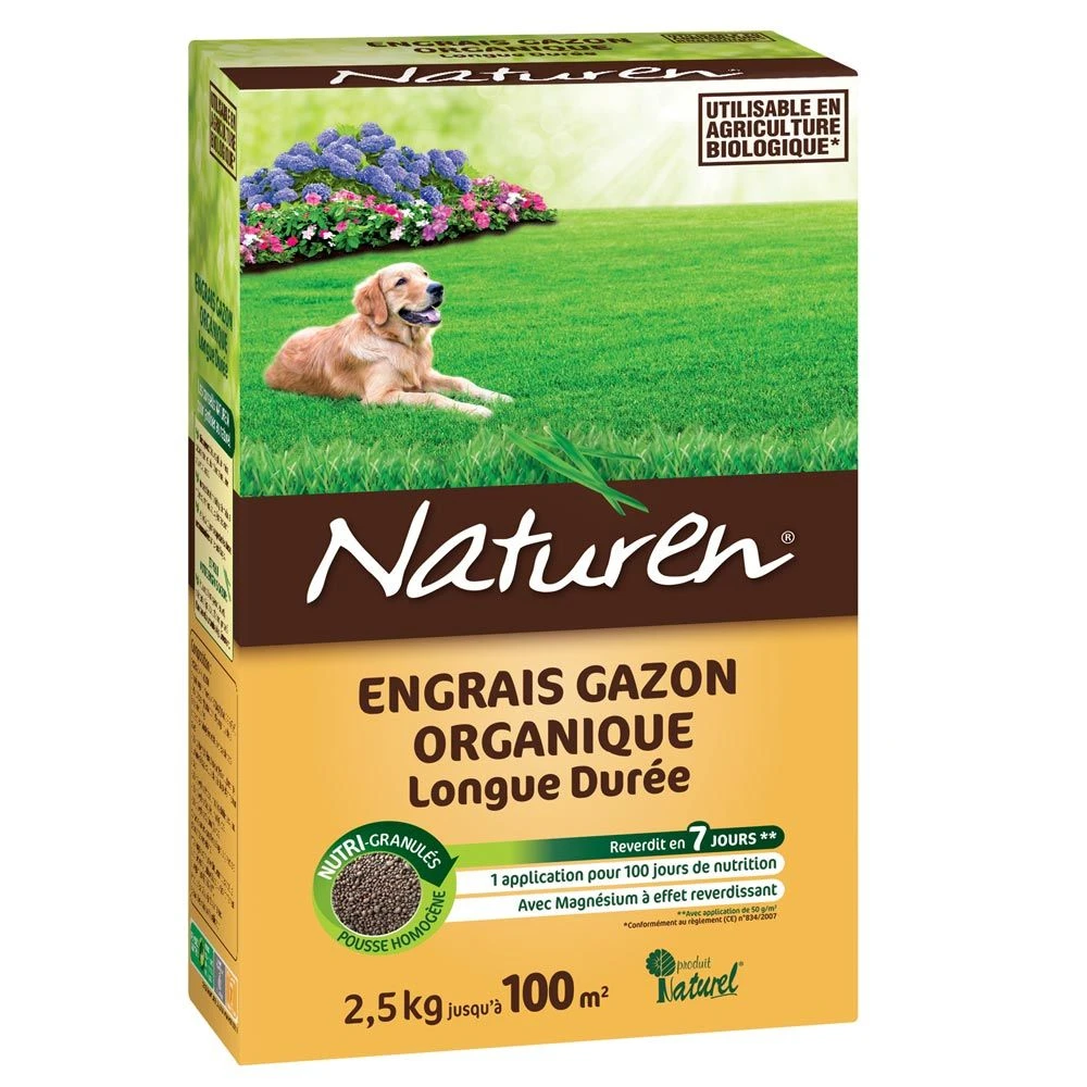 L’engrais gazon s’applique sur tous types de gazon. Formule efficace qui assure un reverdissement en 7 jours avec une dose d’application de 50 g/m². Rend le gazon plus dense et plus robuste. Azote 100% organique : action naturellement progressive. 1 application pour 100 jours de nutrition. Les chiens et chats peuvent revenir après application. Limite les risques de lessivage.