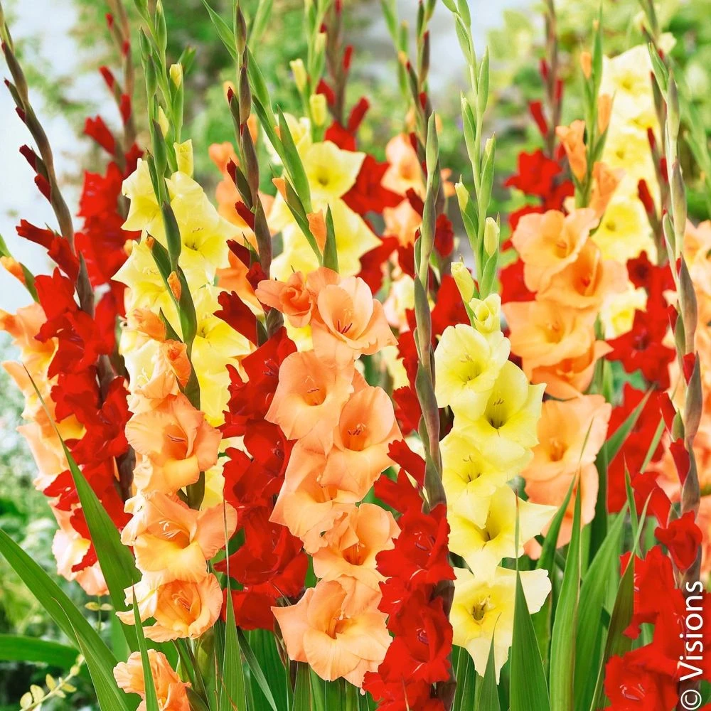 3 sublimes variétés de glaïeuls dans les tons chauds de jaune, orange et rouge, parfaits pour des massifs flamboyants et de plantureux bouquets…
