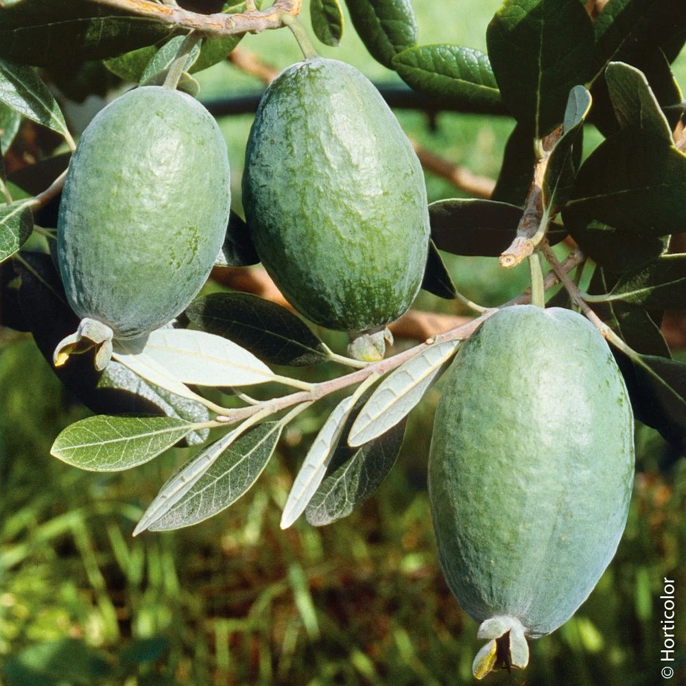 En région favorisée, de septembre à novembre, les fleurs laissent place à de petits fruits verts de 4 à 6 cm qui évoquent de petits avocats à peau rugueuse. Leur chair au goût exotique d’ananas, kiwi et goyave est riche en vitamine B et C. Pour une bonne fructification, outre le climat, l’Acca sellowiana a besoin d’une pollinisation croisée. La plantation de plusieurs sujets est donc primordiale.