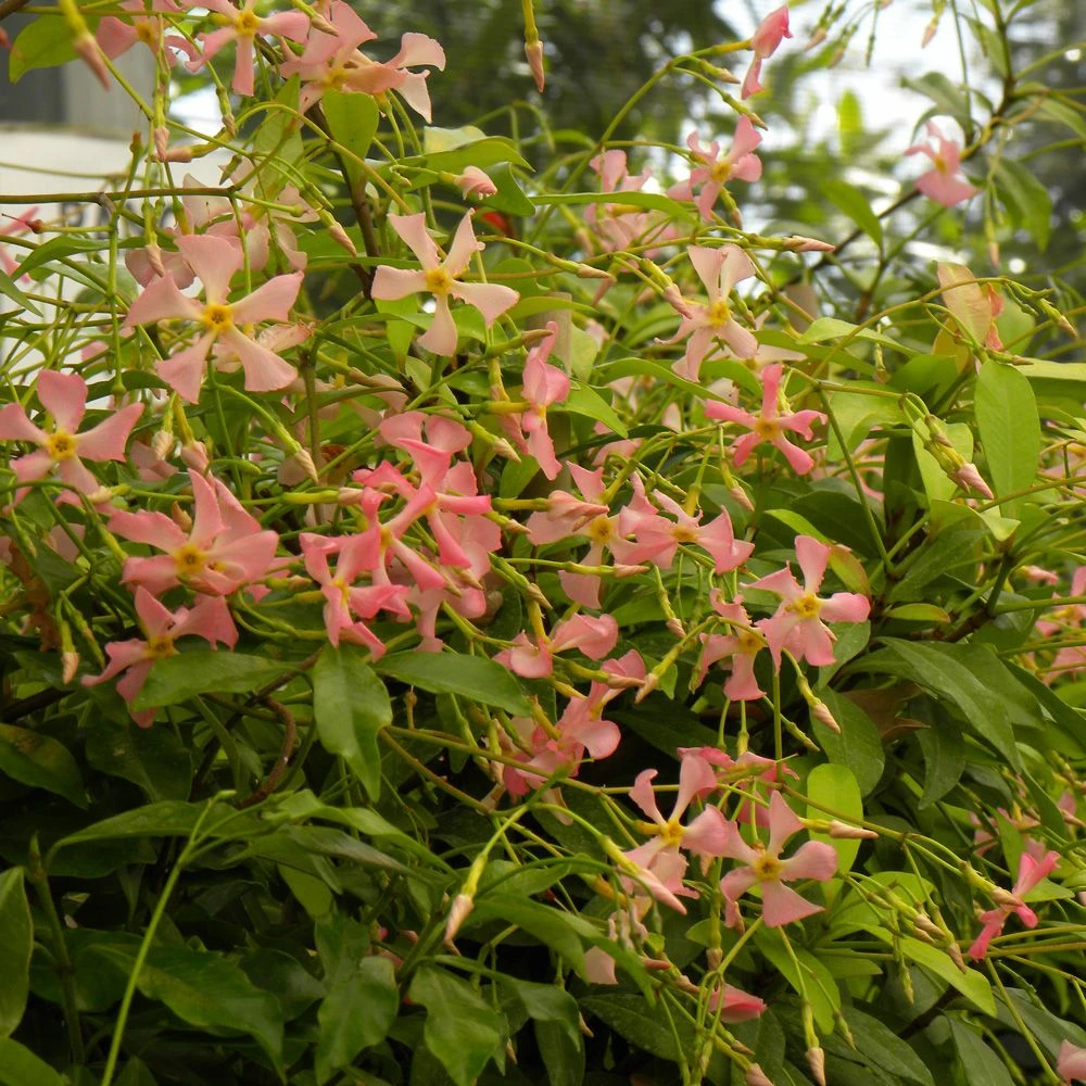 Le jasmin PINK SHOWERS ® est une variété du Trachelospermum asiaticum, originaire du Japon et de Corée, communément nommé faux jasmin jaune, mais rare en culture. PINK SHOWERS ® fait sensation dès son lancement et s’est vu auréolé du 1er prix Innovert au Salon du Végétal en 2016. Si on l’appelle en français jasmin étoilé, le Trachelospermum fait partie des Apocynacées (famille de la pervenche), contrairement au vrai jasmin (Jasminum) qui est une Oléacée.