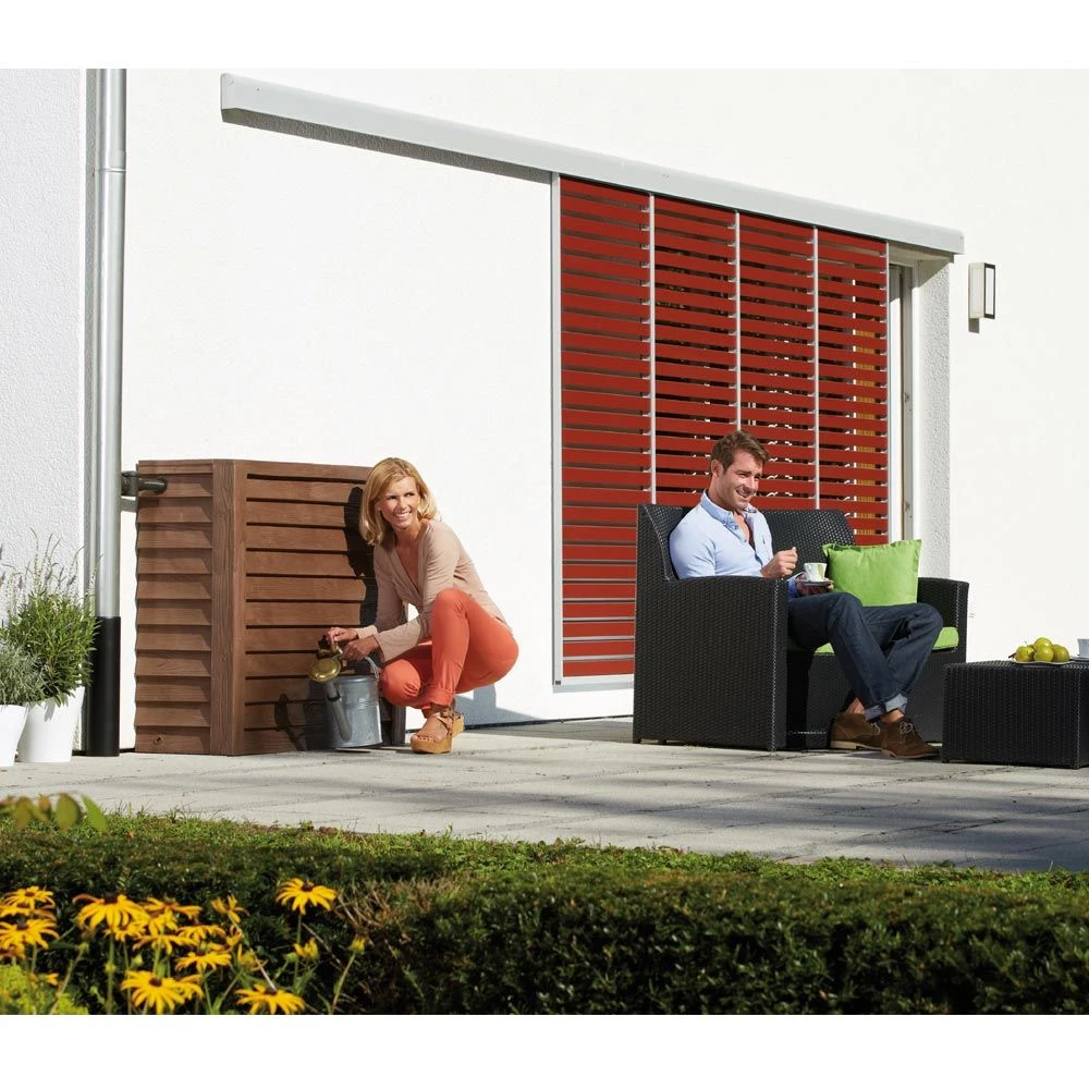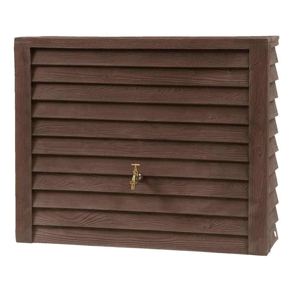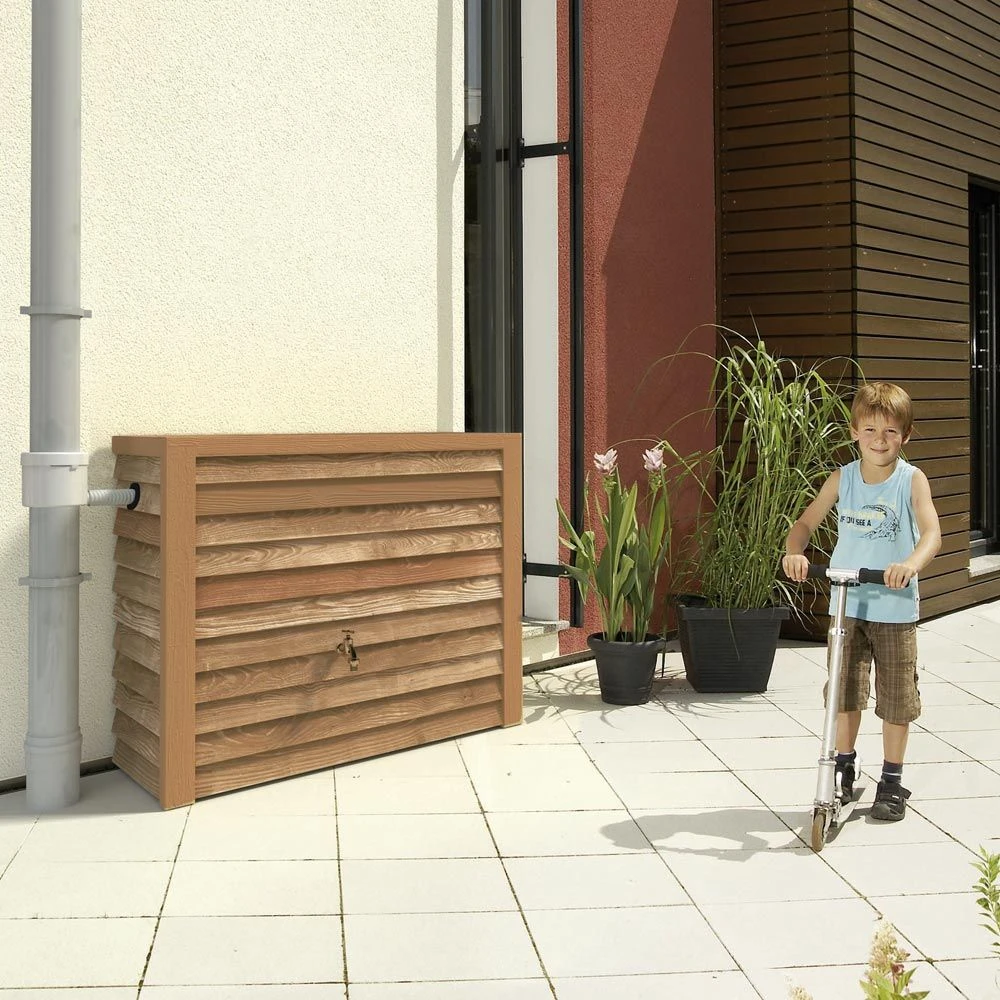 Réservoir d’eau de pluie décoratif en imitation bois à placer contre un mur. Il permet de stocker un grand volume d’eau pour une faible occupation de la surface au sol. Réservoir fabriqué en PEHD. Doit être vidé en hiver.