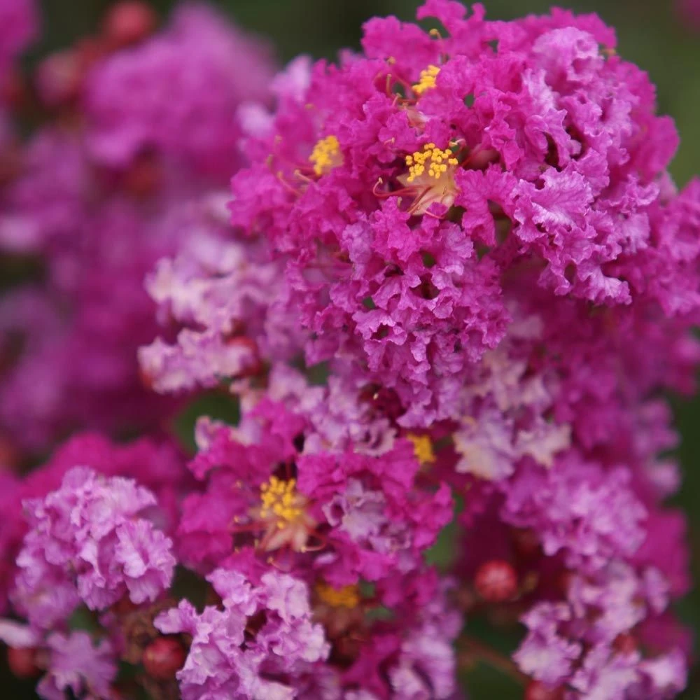 Généreuse et spectaculaire, la floraison du Lagerstroemia INDIYA CHARMS ® VIOLET D’ETE ® ‘Indyvio’ débute dès juillet et se prolonge jusqu’en octobre dans de bonnes conditions. Ses grappes volumineuses se composent de nombreuses fleurs aux pétales frisotés violet pourpre intense rehaussées d’étamines dorées. Les abeilles et autres pollinisateurs viennent butiner ses fleurs avec délectation !
