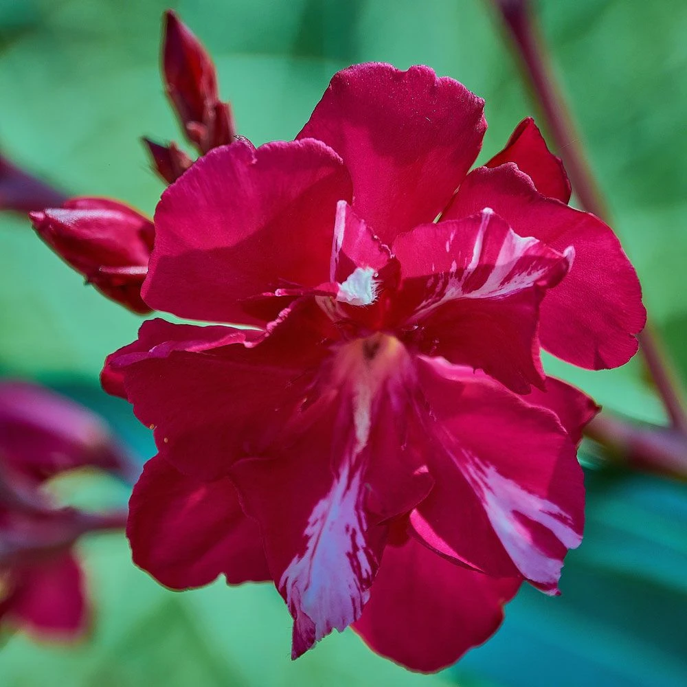 La floraison du laurier-rose Commandant Barthélémy est un pur ravissement. Epanouies de juin jusqu’en septembre-octobre selon le climat, ses fleurs à doubles corolles imbriquées l’une dans l’autre sont groupées en bouquets denses. Leur coloris intense rouge magenta nuancé de rose framboise au cœur s’éclaire parfois de délicates stries blanches. Elles répandent un délicieux parfum sucré qui évoque le miel.