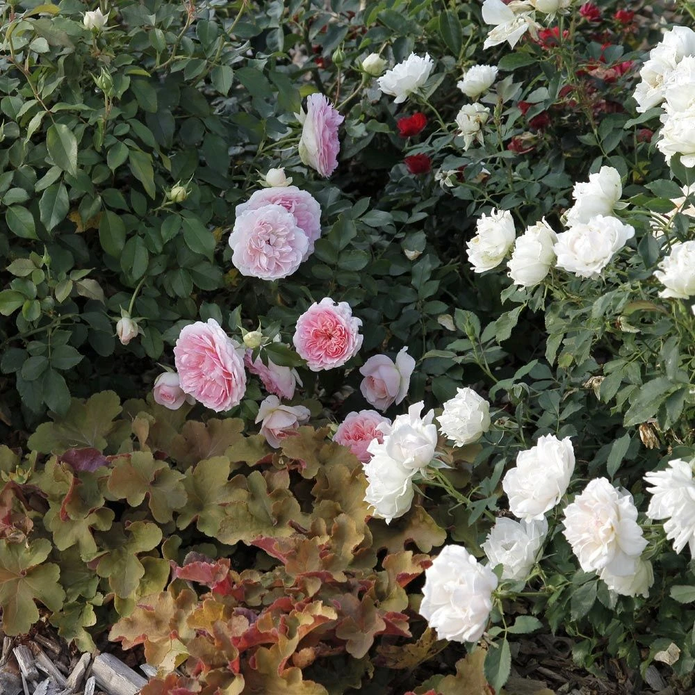 Avec ces 2 rosiers de charme (Rosier Sophia ROMANTICA ® Meisselpier et Rosier Crème CHANTILLY ® Meiradena), vous rĂ©alisez un massif, une bordure ou une allĂ©e très romantique qui s’accordera facilement avec vos autres plantations si besoin. Vous profiterez ainsi du printemps aux gelĂ©es de leurs floraisons abondantes et absolument charmantes, comme du feuillage dĂ©coratif de cette Heuchère MARMALADE ®. Toutes ces plantes sont rĂ©sistantes, demandent peu d’entretien et tolèrent les sols secs sauf la première annĂ©e.