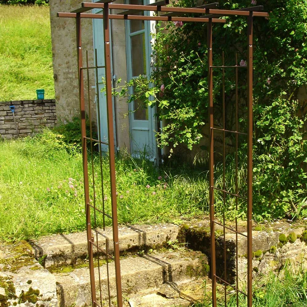 Tuteur Pergola petit modèle pour rosiers et plantes grimpantes. Style à l’ancienne, coloris fer vieilli. Revêtement peinture Epoxy. Montage rapide par emboîtage. Finition soignée avec des caches plastiques aux extrémités de la voute.
