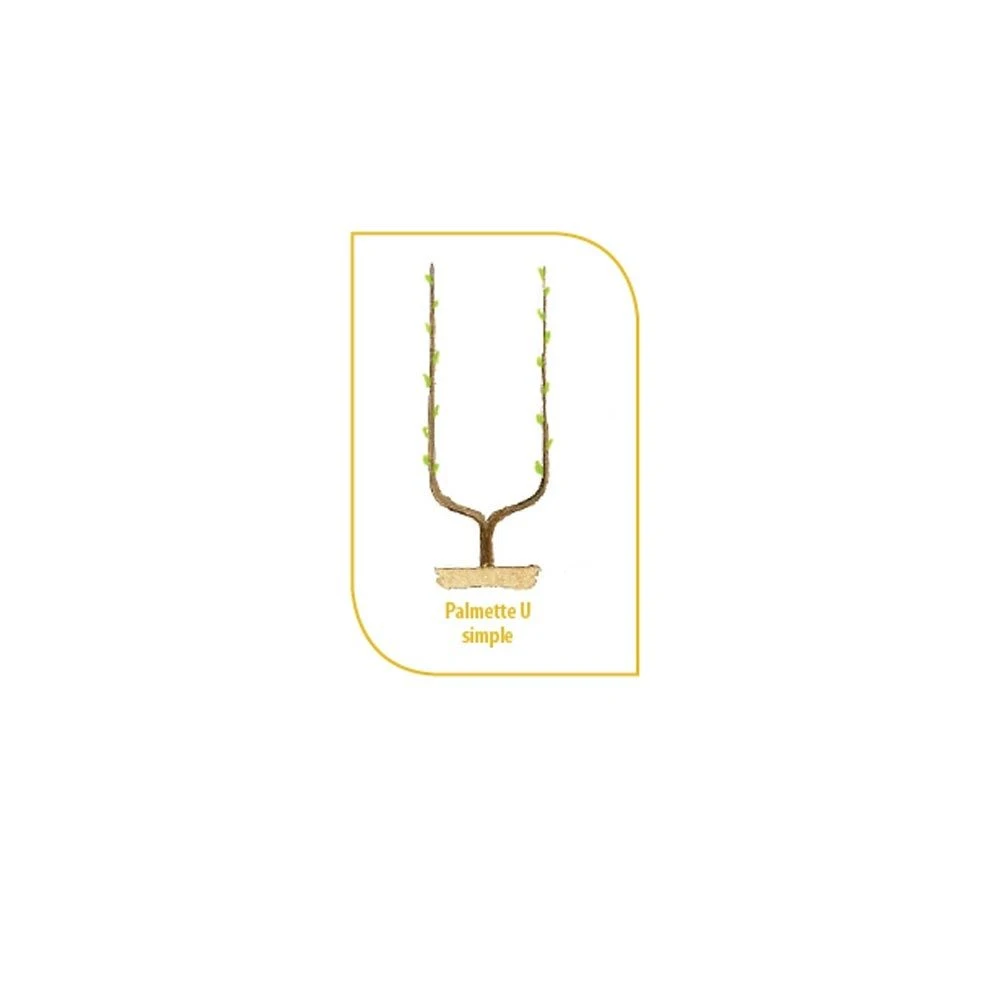 - La palmette U simple : arbre de 3-4 ans (dont 2-3 ans de greffe) en forme taillée U. Le tronc court (30/40 cm environ) porte 2 branches latérales palissées coudées qui forme une silhouette en U. Mise à fruits rapide, 1-2 ans après plantation. Pour petits jardins et haies fruitières. Nos conseils pour les fruitiers en palmette par ici.