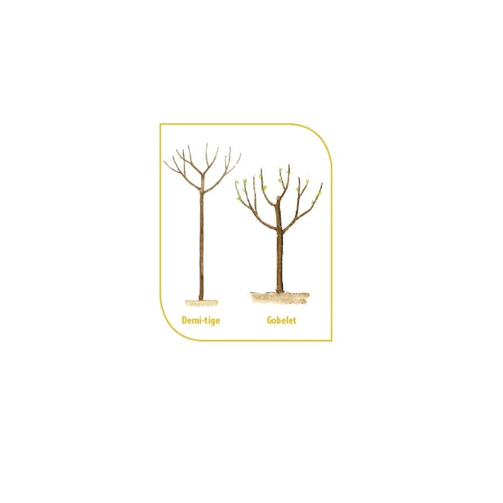 - Le Gobelet : petit arbre de 3 ans (dont 2 ans de greffe). Tronc court de 50/60 cm entre les racines et les premières branches (hauteur définitive). 3 à 5 branches de 20 à 40 cm de long, à retailler court au printemps suivant plantation. Idéal pour les petits espaces. Nos conseils pour les fruitiers en gobelet par ici