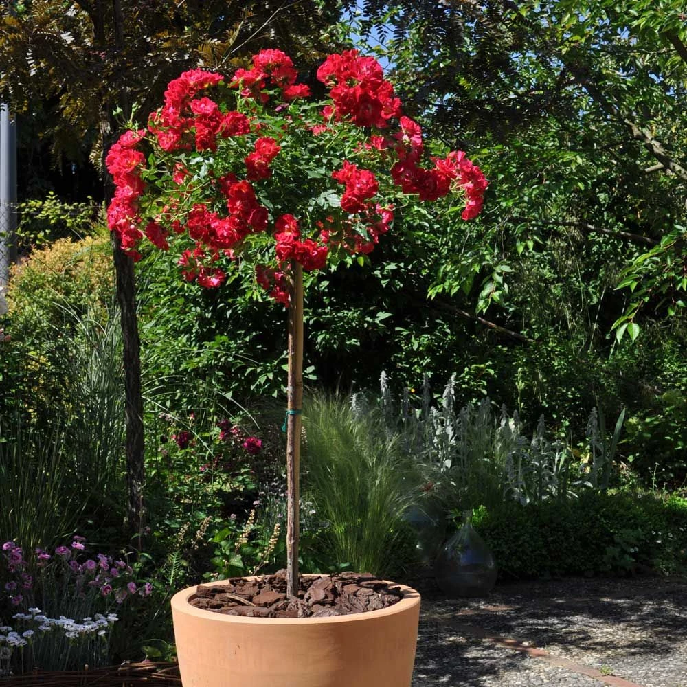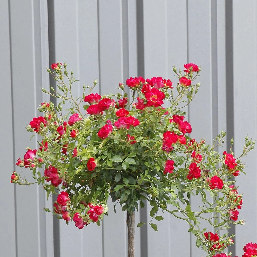 Un splendide rosier sur tige idéal pour les petits espaces, terrasses et balcons ! Le rosier demi-tige semi-retombant Red DRIFT ® Meigalpio est greffé sur une tige de 60/80 cm.
