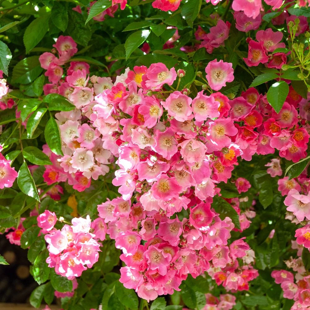 Si, prises individuellement, les petites roses simples de 3 cm du rosier grimpant liane Maria Lisa ne payent pas de mine, leur abondance est telle que la floraison est à couper le souffle ! Réunies en grappes de 5 jusqu’à plus de 40 boutons, les églantines légèrement odorantes comptent 5 à 7 pétales rose cerise vif à base blanche, encadrant un bouquet d’étamines jaunes très attrayant pour les abeilles et autres pollinisateurs.