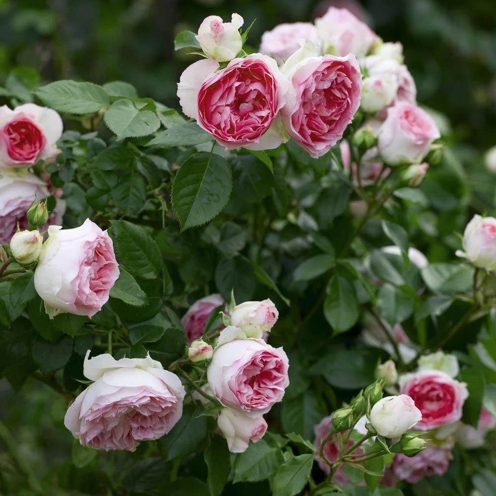 Doté d’une floribondité hors normes, le rosier grimpant Mini PIERRE DE RONSARD ® Meibigboni s’habille de nombreuses grappes de petites roses au charme suranné, qui n’est pas sans évoquer les roses pompons de nos aïeuls. Comptant en moyenne 2 à 5 fleurs, les inflorescences peuvent porter jusqu’à 15 fleurs qui s’épanouiront progressivement. Les roses se composent d’environ 25 à 30 pétales qui s’ordonnent en coupe creuse dessinant de légers quartiers comme les roses d’autrefois. Blanc rosé nuancé de rose plus soutenu, elles évoquent bien le célèbre PIERRE DE RONSARD ® Meiviolin par leur teinte, et sont nettement plus petites avec leurs 6-7 cm de diamètre. Par contre, elles compensent par leur grand nombre ! Les grappes de fleurs tiennent bien en vase et composent de délicats bouquets, notamment mélangées avec d’autres roses romantiques.