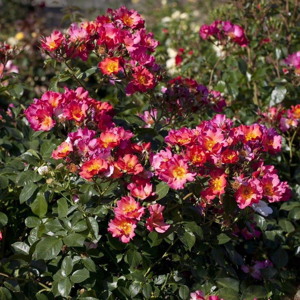 Selon le stade d’épanouissement et le climat, chaque rose combine à sa façon les teintes ocre, rose cuivré et orangées sur ses pétales à base jaune pour un aspect moderne très raffiné admiré de près. Vues dans l’ensemble, ses floraisons massives prennent une allure nuancée et changeante du plus bel effet ! En l’absence de taille estivale, ses branches se couvrent d’une abondante fructification rouge foncé en automne très appréciée des oiseaux. Un rosier bénéfique pour la biodiversité, en résumé…