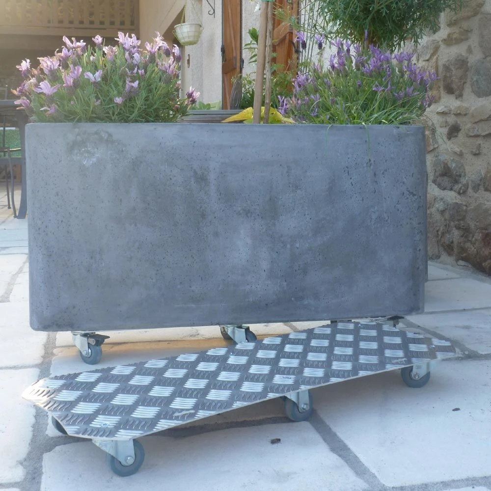 Réalisé en aluminium, matériau robuste et inaltérable, le Roule plante rectangle vous assiste dans le déplacement de vos bacs jusqu’à 150 kg. Pensez à bien répartir la charge à déplacer en installant le bac au centre du plateau. Très discret une fois installé sous les bacs, le Roule plante grâce à ses roulettes multidirectionnelles, dont une est équipée de frein, permet un déplacement de vos bacs en tous sens. Le frein maintient les bacs à leur place en toute sécurité.