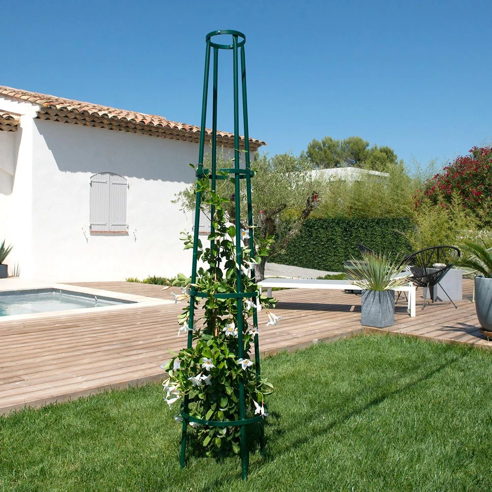 Tuteur colonne corset pour le palissage des rosiers grimpants. Montage rapide par vis et emboĂ®tage (visserie fournie). La conception « Corset » permet l’installation après la plantation du rosier, sans risque d’endommagement du vĂ©gĂ©tal. Ossature tube : diamètre 20 mm et fer plat, vert acier Ă©poxy anti-rouille.